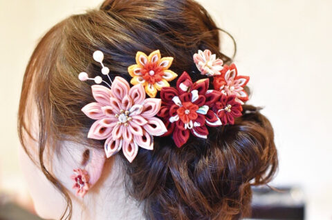 素材は着物地を使っていましたが、いまは洋服とコーデしやすいよう洋生地が多いです。つまみ細工のアクセサリーは軽くて着けていてもストレスフリー!成人式で使いたいとか浴衣にあわせたいとオーダーを頂くこともあって、その場合は、お客さんと話しあいながら一緒にデザインしていく感じです。